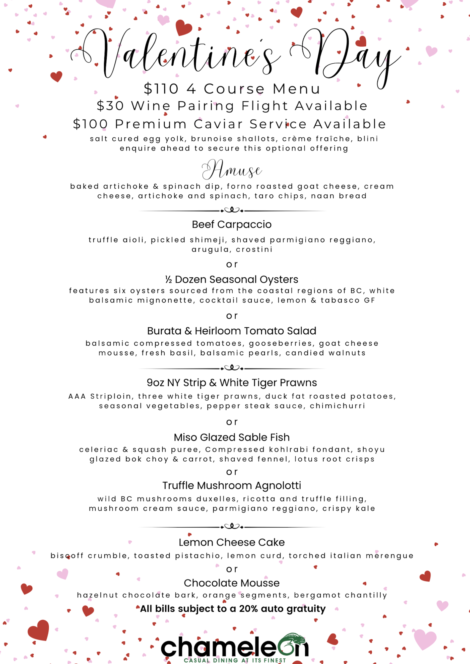Celebrate Valentine’s Day with an intimate, chef-curated dining experience available for one night only. Our Executive Chef, Daniel Schreuder, has designed an exclusive four-course prix fixe menu that guides you through the evening with refined flavours, elevated ingredients, and thoughtful presentation — created to be shared, savoured, and remembered. The evening begins with an indulgent amuse, followed by a selection of elegant starters, refined mains, and decadent desserts, all crafted specifically for this event. Guests may enhance their experience with a $30 optional wine pairing flight, thoughtfully selected to complement each course, or elevate the night further with a premium caviar service available by request. This is a prix fixe–only, adult-only experience, allowing our team to focus entirely on delivering a seamless, romantic evening from start to finish. Seating is limited, and availability is exclusive to Valentine’s Day. Seatings are available from 5:00 PM, with the last seating at 8:30 PM. A 20% autogratuity will be applied to all bills.